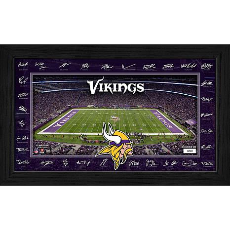 Display your fandom in style with this 12" x 20" Signature Gridiron frame, showcasing an individually hand-numbered print of the Minnesota Vikings home field and surrounded by the facsimile (replica) signatures of most of the 2025 team roster. Elegantly presented under acrylic glass, this officially licensed collectible is a limited edition of 5,000 (and accompanied by a certificate of authenticity).