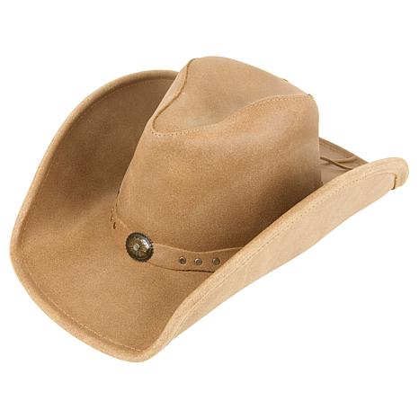 Embrace the country lifestyle with this distressed ruff leather hat. This wide-brimmed hat has steel wire hidden inside the brim, which lets you shape it anyway you want. A stylish leather band, studs and metal conchos surround the western hat with a small tie in the back. This durable classic keeps the sun out and is made to last.