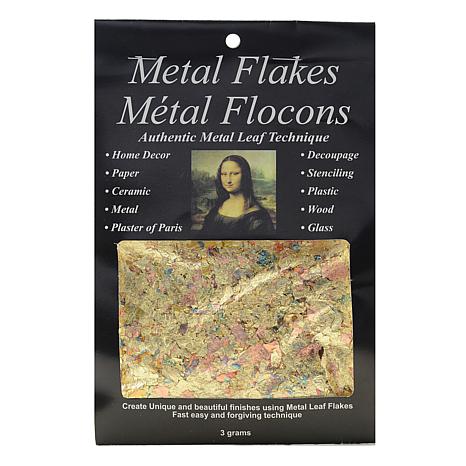 Use these metal flakes to create unique and beautiful finishes on home decor, paper creations, decorative ceramics, glass projects and more. The technique is fast, easy and forgiving. Apply Mona Lisa Adhesive to wood, metal, ceramic, glass, plaster of Paris, plastic or paper. Sprinkle and press the flakes over the tacky areas of your design. Use a brush to remove any loose pieces to save for additional applications. Mona Lisa Metal Flakes come in 3g packages.