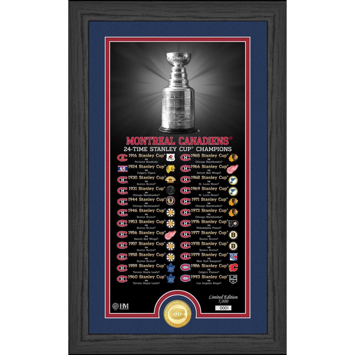 Celebrate the legendary Montreal Canadiens with this stunning framed collectible that honors their 24 Stanley Cup championships. Perfect for any hockey fan, this piece adds a touch of history and pride to your home or office. Display it proudly and enjoy a unique keepsake that’s officially licensed and crafted with care.