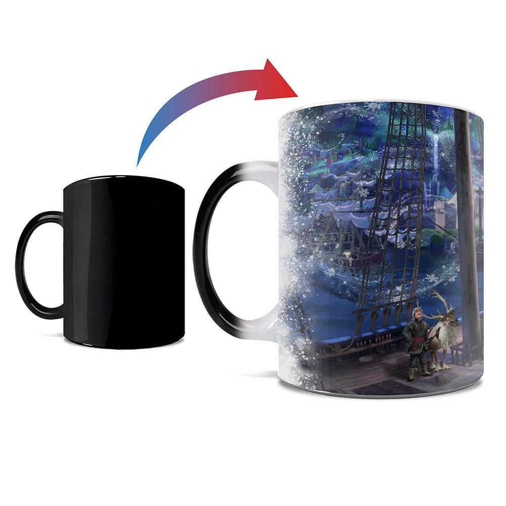 Bring the magic of Arendelle to life with every sip. This officially licensed Frozen Morphing Mugs heat-sensitive mug features stunning artwork by Thomas Kinkade Studios, revealing a breathtaking winter scene when hot liquid is added. As the mug warms, the all-black exterior transforms to unveil Elsa, Anna, Kristoff, Sven and Olaf aboard a grand ship surrounded by sparkling magic and icy wonder.