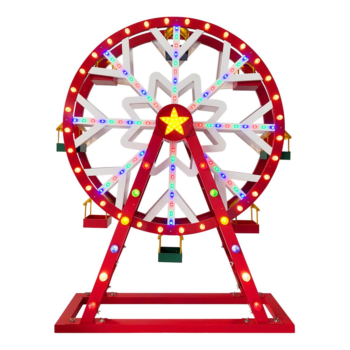 Transform your yard into a holiday carnival with this oversized animated ferris wheel. Towering at an impressive 5.5', this vibrant decoration is crafted to bring festive charm and whimsy to your outdoor display. Illuminated by more than 150 dazzling LED lights in red, green, blue, and warm white, it features eight stunning light shows, including twinkling, chasing, and flashing effects, guaranteed to enchant your neighborhood. Designed for durability, it comes with an adapter, ensuring it shines through the entire season. The spinning wheel adds a magical, dynamic touch, while its nostalgic Christmas colors and retro-inspired design evoke timeless holiday cheer.
