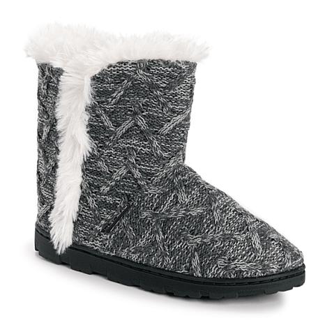 Pull on these sweet knit MUK LUKS® Cheyenne Bootie Slippers for serious comfort. Warm faux fur lining, foam insole and durable indoor/outdoor sole make this sweet bootie a cold weather favorite.