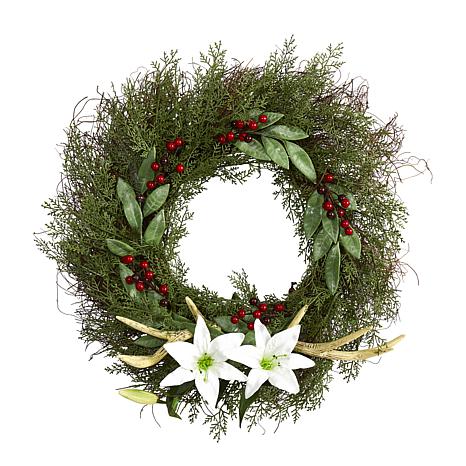 Nearly Natural 20” Cedar, Antlers, Lily and Ruscus with Berries Wreath