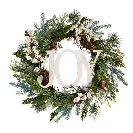 Nothing says Christmas like a classic Christmas artificial wreath. Soft-hued evergreens add an instant sense of freshness and are accented by faux berries and pinecones so lifelike you'll think they're real. Spread holiday cheer with the joy lettering across the wreath. With a dimension of 24", house in any bare wall or door.