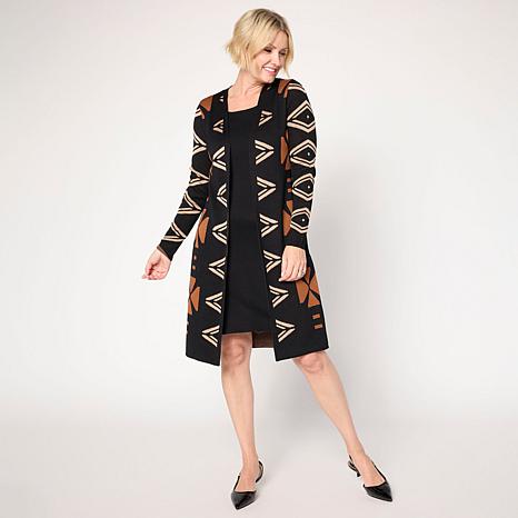 Elevate your wardrobe with this chic jewel neck twofer midi dress, designed to strike the perfect balance between style and comfort. The pullover design features a knit print fabrication, creating the illusion of a layered look with its faux jacket open front and straight skirt. Long sleeves provide added elegance, making it ideal for both professional settings and evening outings.
