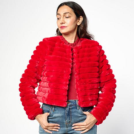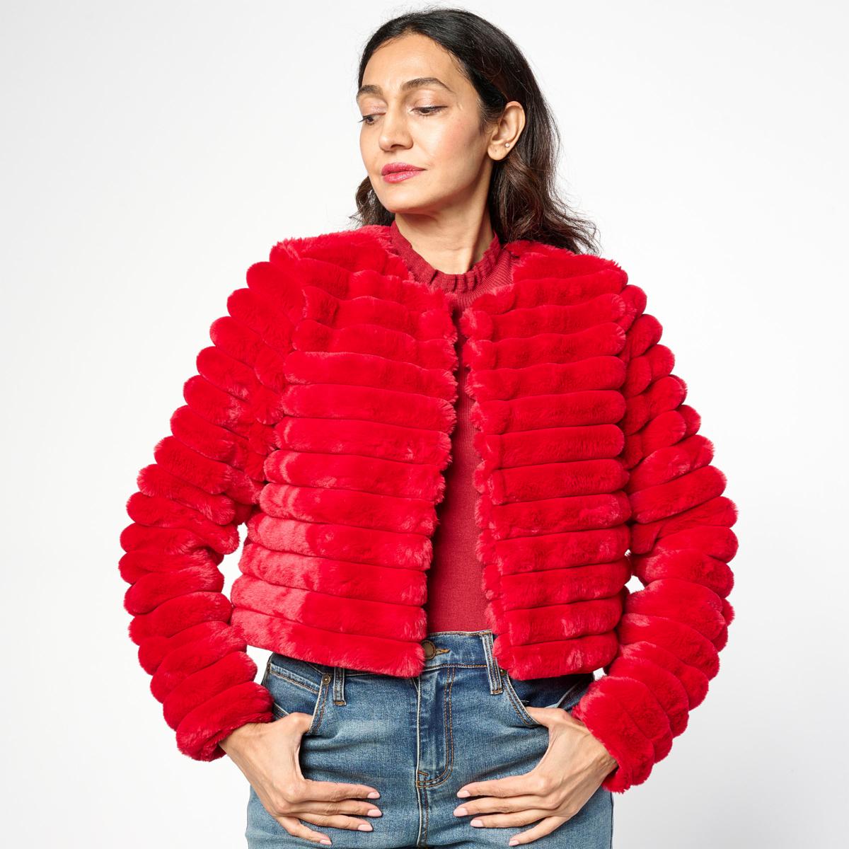 This chic bolero features soft faux fur with a striped horizontal pattern that adds texture and style to any outfit. The hook and eye top closure keeps it secure while the long sleeves provide cozy coverage. Perfect for layering over dresses or tops to elevate your holiday look with a touch of luxe warmth.