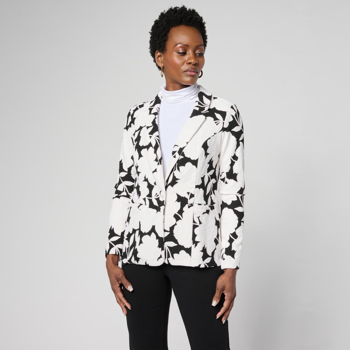 This sleek suit jacket features a single button closure and a classic collar for a polished look. The puff print 3D high tech crepe fabric adds texture and dimension, making it a standout piece for your wardrobe. Perfect for layering over your favorite tops, it effortlessly elevates any outfit with style and comfort.
