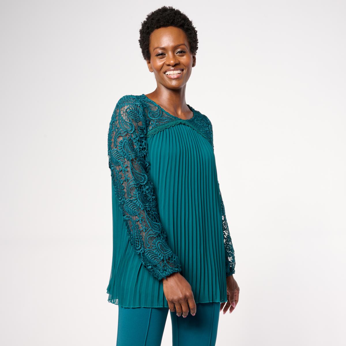 This elegant top features a round neck with delicate pleats and bubble long lace sleeves that add a touch of romance to your look. The lace yoke enhances the feminine charm, making it perfect for both casual and dressy occasions. Pair it with your favorite jeans or a skirt for effortless style that transitions from day to night.