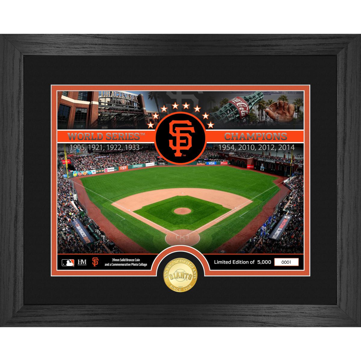 This limited edition 13” x 16” frame commemorates the San Francisco Giants World Series titles and features their stadium combined with a minted team coin. Double matted under glass is the individually hand numbered photo print and a 39mm solid bronze minted coin. As a limited edition of only 5000 and officially licensed by the MLB and MLBPA each photo mint is accompanied by a certificate. Proudly made in the U.S.A. by The Highland Mint!