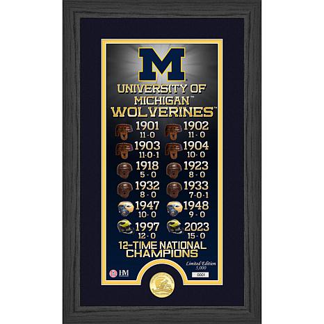 A limited-edition collectible frame commemorating the Michigan Wolverines 12 Football National Championships. A custom and individually numbered commemorative print listing each of the Wolverines National Championships with the team helmet from the era of the championship. The print is combined with a minted niversity of Michigan 12-time National Champions bronze coin.