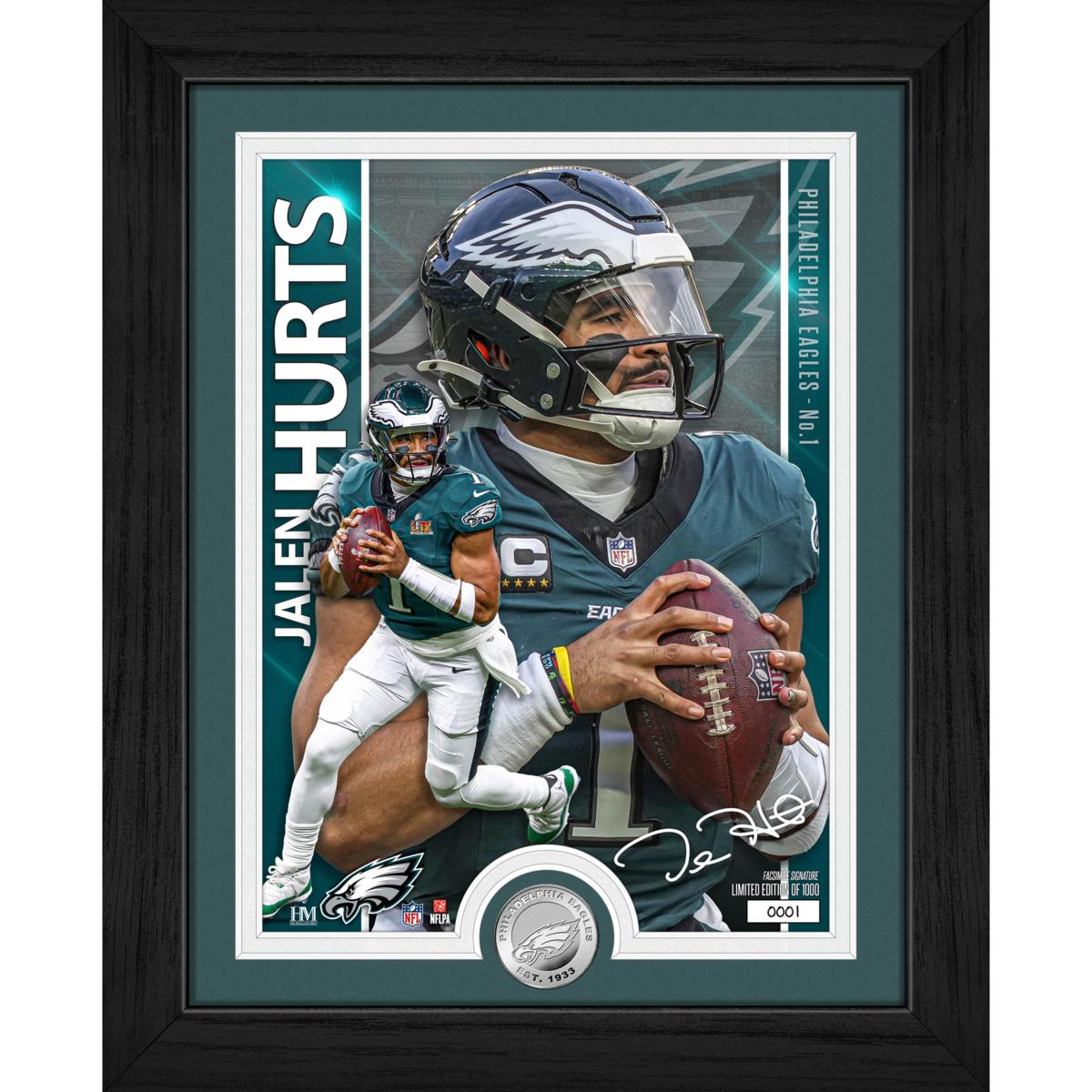 Philadelphia Eagles' Jalen Hurts is featured in this limited edition 13" x 16" framed collectible that includes a stunning 8" x 11" custom-designed artist print and a minted 39mm Philadelphia Eagles silver-plated coin. Elegantly double-matted and protected under acrylic glass, this premium display piece is a must-have for NFL fans and collectors. Only 1,000 individually numbered pieces exist — each officially is licensed by the NFL and NFLPA and includes a certificate. Proudly made in the U.S.A. by The Highland Mint, this collectible arrives ready to hang and ready to impress.