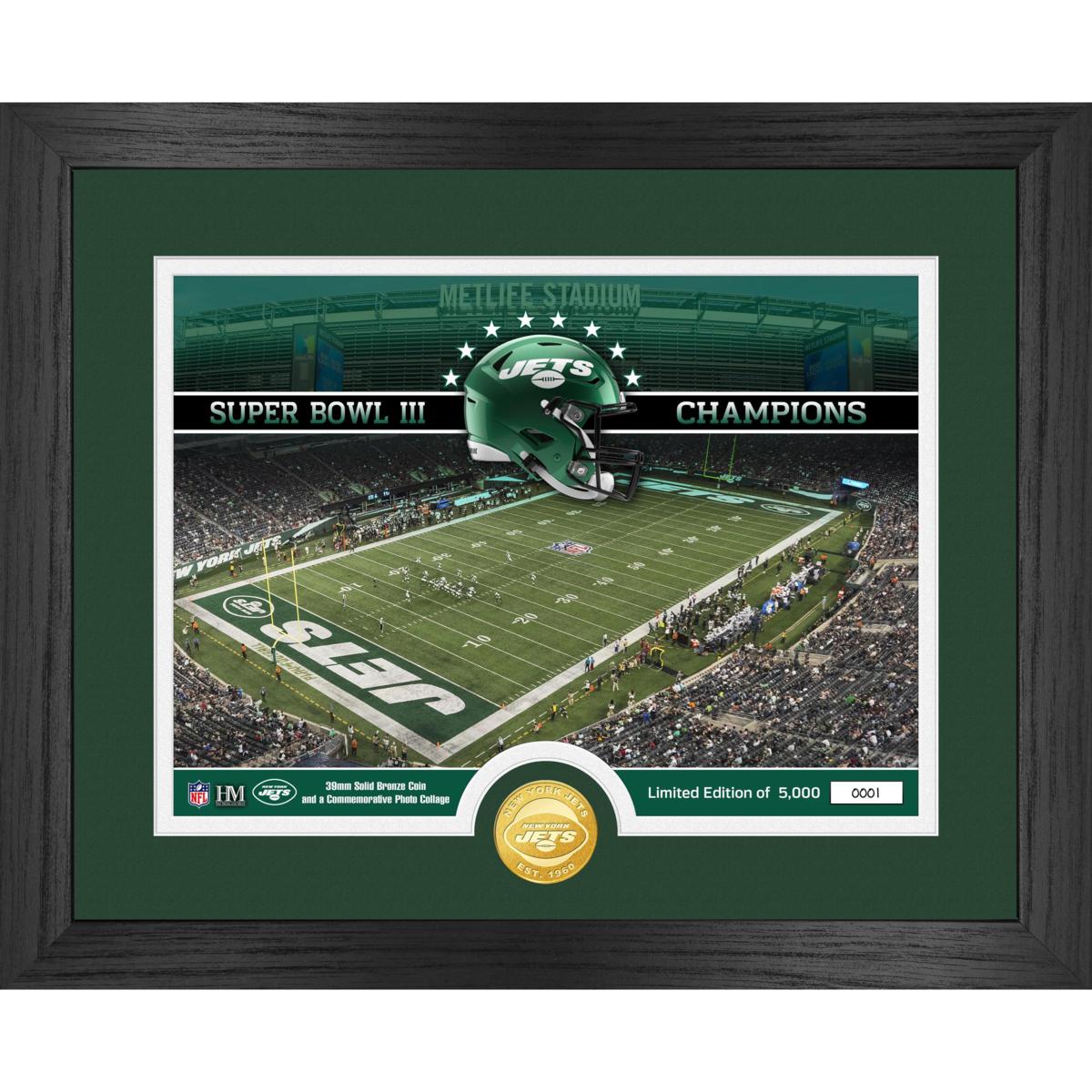Celebrate your Jets. Featured in a 13” x 16” frame with double-matting and under glass, this hand-numbered 8" x 10" custom print commemorates the New York Jets and is combined with a 39mm minted bronze team coin. It is part of a limited edition of only 5000, it is accompanied by a certificate of authenticity, and it is proudly made in the U.S.A. by The Highland Mint. Go team!