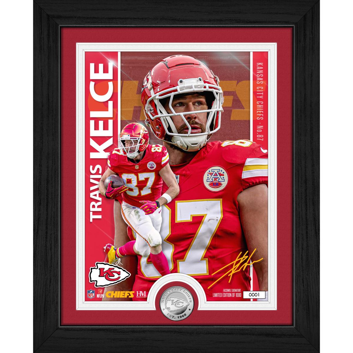 Kansas City Chiefs' Travis Kelce is featured in this limited edition 13" x 16" framed collectible that includes a stunning 8" x 11" custom-designed artist print and a minted 39mm Kansas City Chiefs silver-plated coin. Elegantly double-matted and protected under acrylic glass, this premium display piece is a must-have for NFL fans and collectors. Only 1,000 individually numbered pieces exist — each officially is licensed by the NFL and NFLPA and includes a certificate. Proudly made in the U.S.A. by The Highland Mint, this collectible arrives ready to hang and ready to impress.