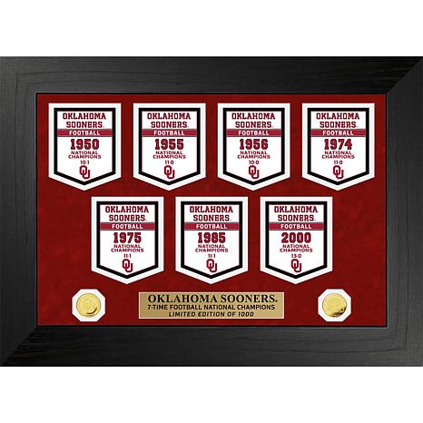 A limited edition of only 1000, this deluxe championship banner collection commemorates the University of Oklahoma Sooners national titles. Featured in a black 18" x 22" wood frame, with 2.5" wide molding, and suede double matting under a protective acrylic glass panel are commemorative championship banners, representing each of the College Football National Championship games won. Included under the banners is two 39mm in diameter minted commemorative coins. Each minted coin is carefully plated with 24KT Gold. An engraved nameplate is featured between both minted coins. A certificate of Authenticity accompanies each collectible frame. Officially licensed and proudly made by The Highland Mint.