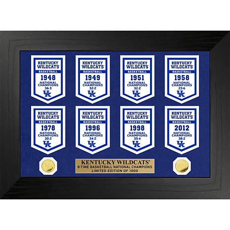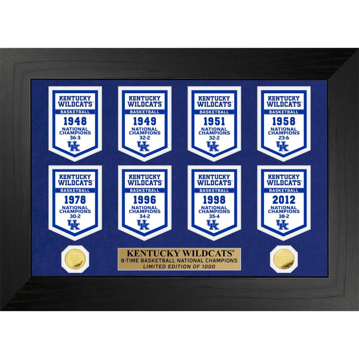 A limited edition of only 1000, this deluxe championship banner collection commemorates the University of Kentucky Wildcats basketball National titles. Featured in a black 18" x 22" wood frame, with 2.5" wide molding, and suede double matting under a protective acrylic glass panel are commemorative championship banners, representing each of the College Basketball National Championship games won. Included under the banners is two 39mm in diameter minted commemorative coins. Each minted coin is carefully plated with 24KT Gold. An engraved nameplate is featured between both minted coins. A certificate of Authenticity accompanies each collectible frame. Officially licensed and proudly made by The Highland Mint.