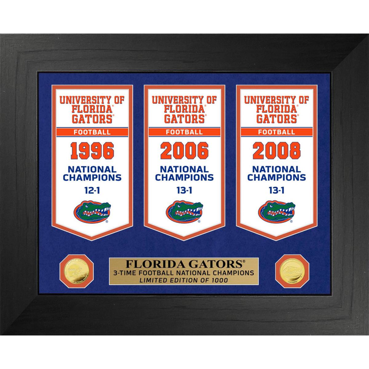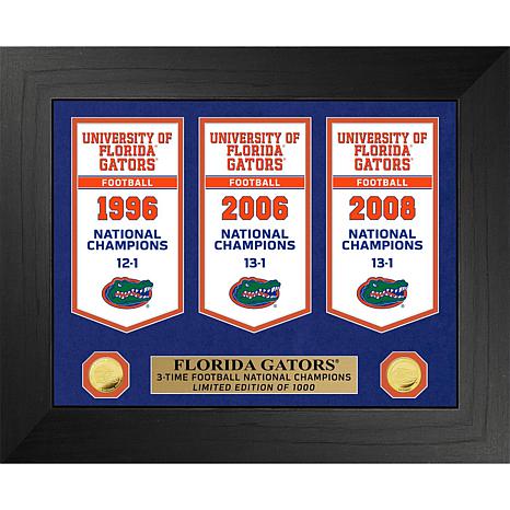 A limited edition of only 1000, this deluxe championship banner collection commemorates the University of Florida Gators national titles. Featured in a black 18" x 22" wood frame with 2.5" wide molding and suede double matting under a protective acrylic glass panel are commemorative championship banners, representing each of the College Football National Championship games won. Included under the banners is two 39mm in diameter minted commemorative coins. Each minted coin is carefully plated with 24KT Gold. An engraved nameplate is featured between both minted coins. A certificate of Authenticity accompanies each collectible frame. Officially licensed and proudly made by The Highland Mint
