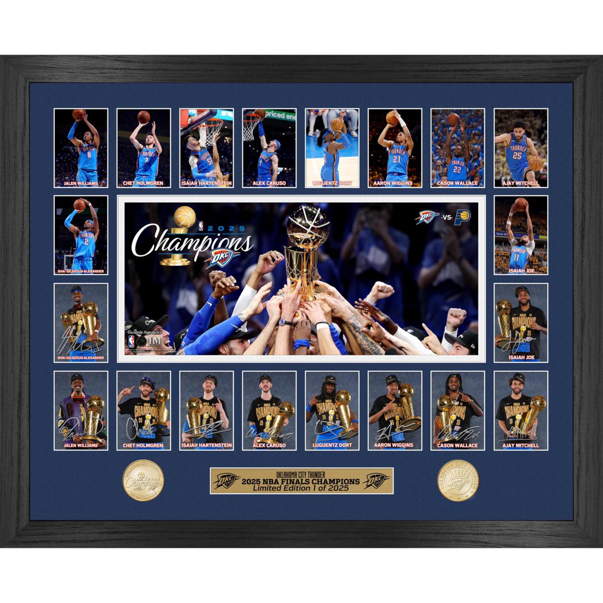Honor the Oklahoma City Thunder's 2025 NBA Championship with this impressive, limited-edition collectible. The framed piece showcases a team image captured after their title-clinching victory, surrounded by individual player prints with replica signatures. Below the photos are two 39mm bronze minted coins — one celebrating the 2025 NBA Champions and the other featuring the Oklahoma City Thunder team logo. Limited to just 2,025 pieces!