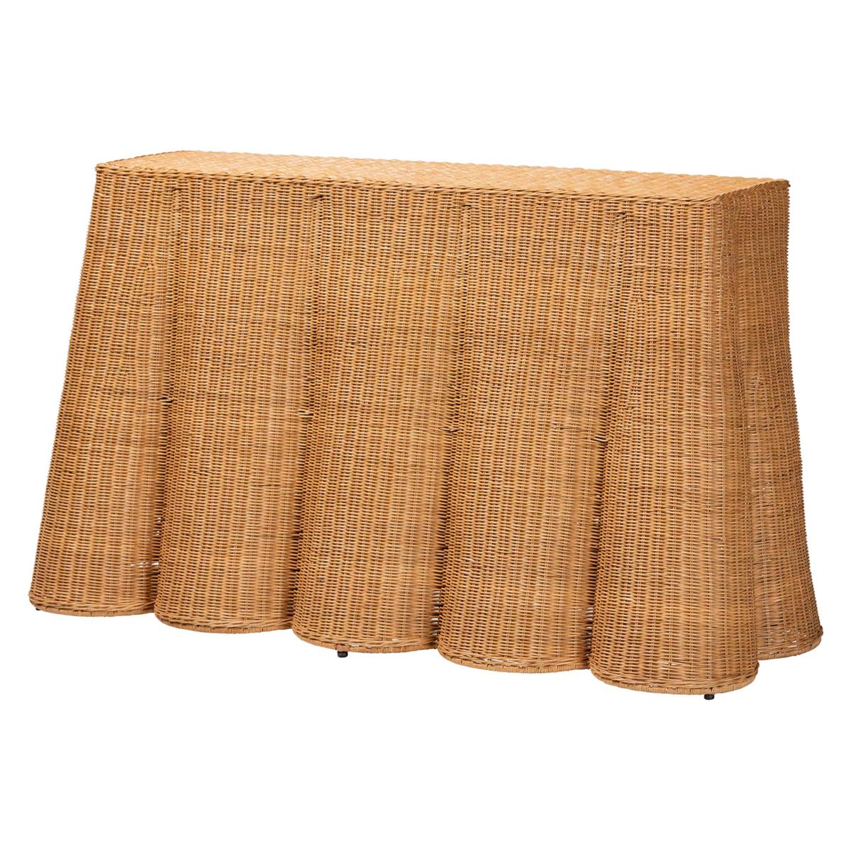 Bring a touch of rustic elegance to your home with this stunning Palm console table. Crafted in Indonesia, it features a minimalist metal frame paired with handwoven rattan by skilled artisans, creating a soothing scalloped base design that highlights your décor. Perfectly sized for entryways or living rooms, the broad rectangular tabletop offers ample space to showcase your favorite accents.