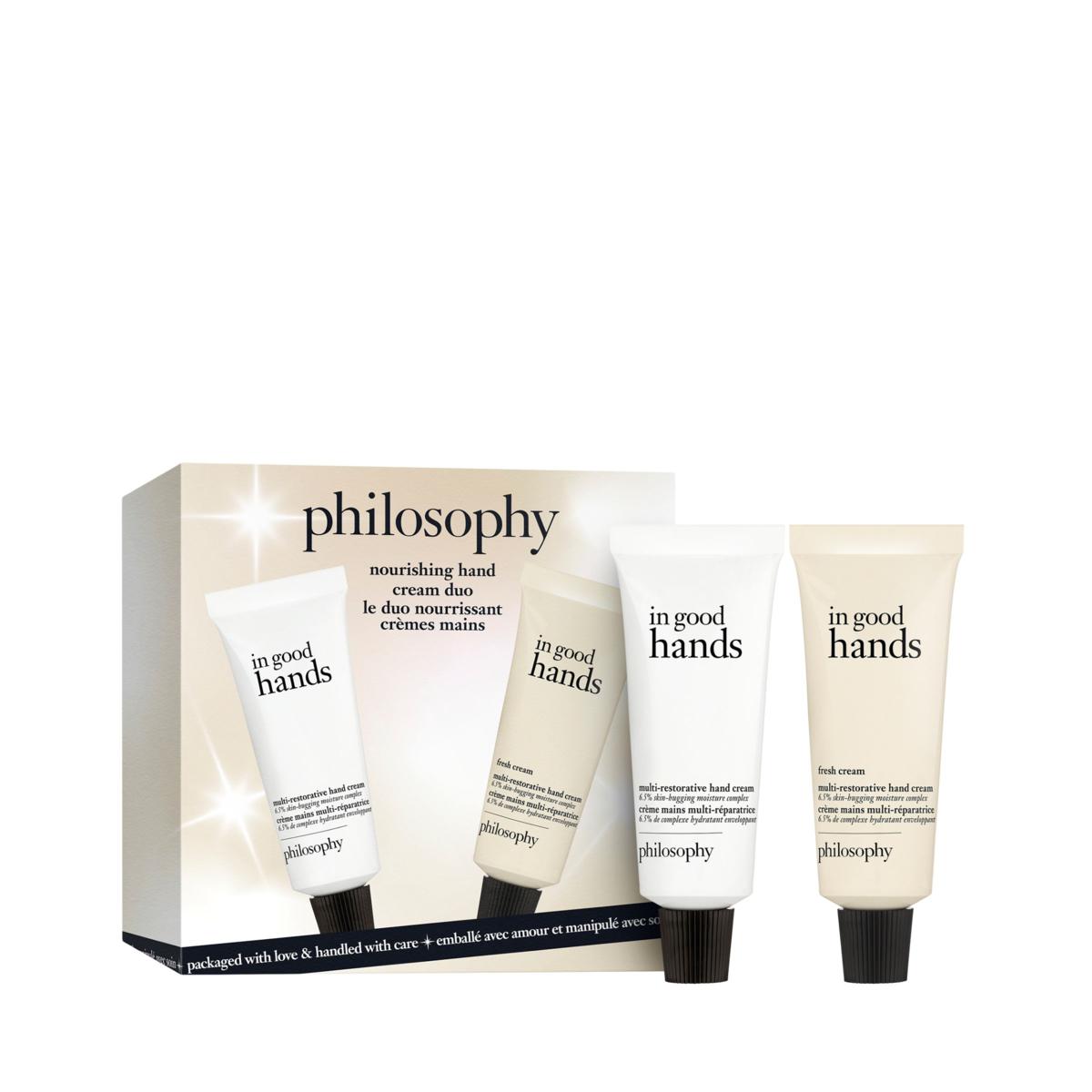 Giftable cheer comes once a year. 'tis the season for sharing a special delivery with a philosophy gift set that is packaged with love & handled with care. let the festive season begin with the philosophy in good hands hand cream duo gift set. wrapped up for the holiday season in a special-edition design, it makes the perfect gift. the satiny formula of this hand cream helps your skin appear youthful looking. stay soft while staying connected—our formula absorbs quickly