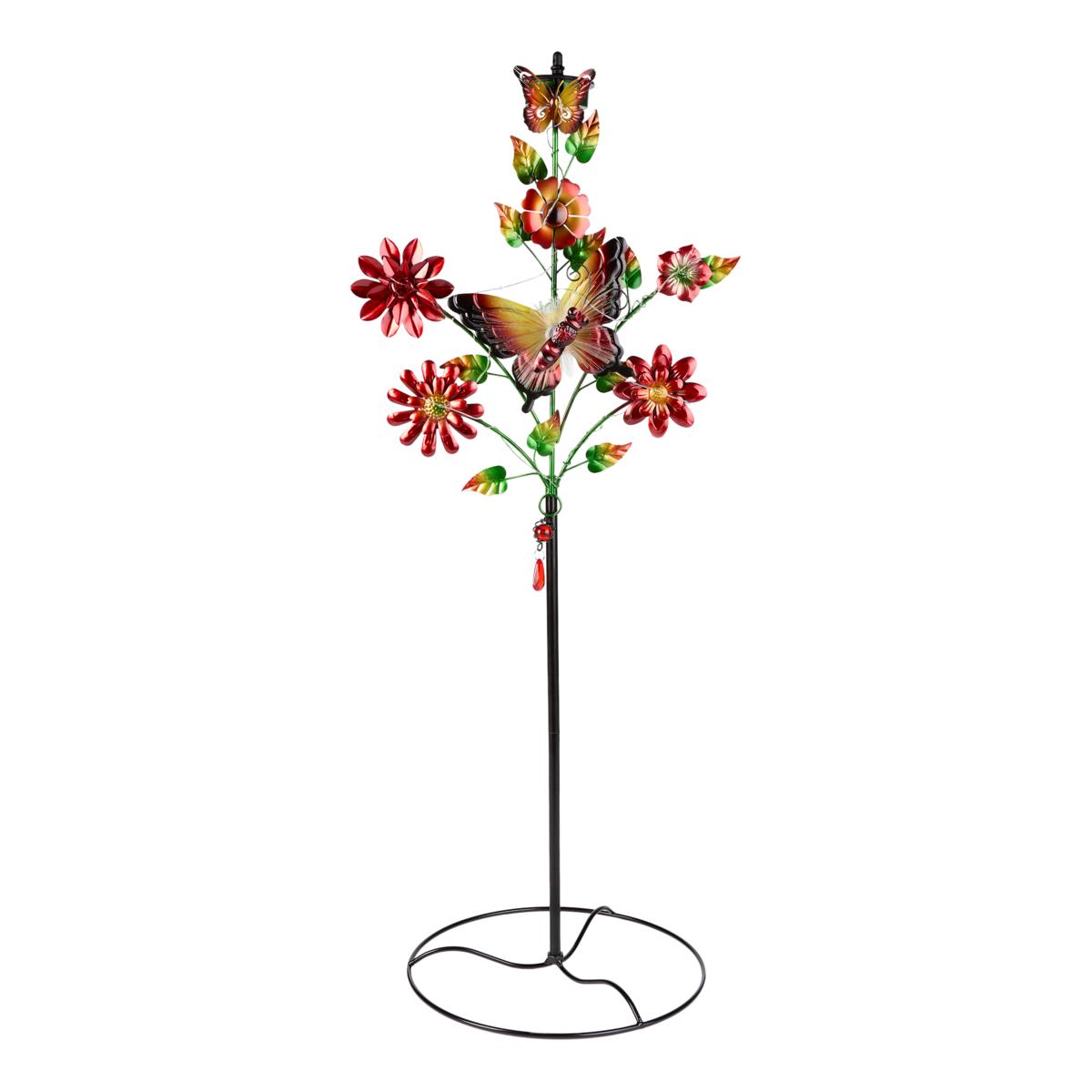 This durably and brightly painted solar metal garden decor combines versatility and functionality. It can be set up as a tabletop display, or can be hung by the included chain, or hung as wall decor, or used as a stake in your yard or garden. Place in sunlight during the day, and the LED bulbs and fiber optic end piece will automatically light up into the night, powered by the included AA rechargeable battery.