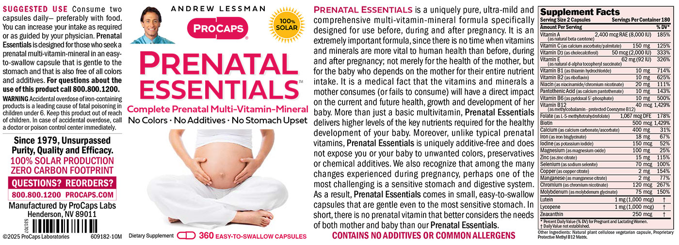 - Prenatal Essentials is designed for those who seek a prenatal multi-vitamin-mineral in an easy-to-swallow capsule that is gentle to the stomach and that is also free of all colors and additives.