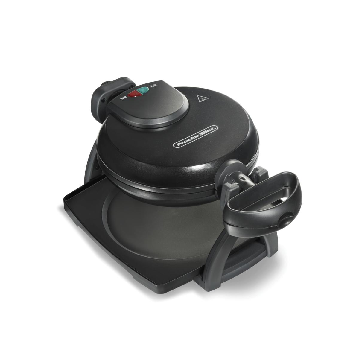 It's easy to cook restaurant-quality Belgian waffles at home in minutes with the Proctor Silex® Flip Belgian Waffle Maker. The flipping action ensures waffles are thick, fluffy and evenly golden-brown every time. Enjoy your waffles with fresh fruit, syrup, or let everyone choose their own toppings for fun, family breakfasts. With nonstick plates, it's easy to remove your waffles from the waffle maker after they're cooked because there's no sticking. Flipping waffles is effortless with a cool-touch handle that's easy to grip. The waffle maker is simple to use with power on and ready indicator lights, so there's no guesswork. When the green ready indicator light illuminates, it's time to add the waffle batter. The nonstick waffle maker plates are simple to wipe clean, and the removable drip tray catches splatters down below to reduce mess.