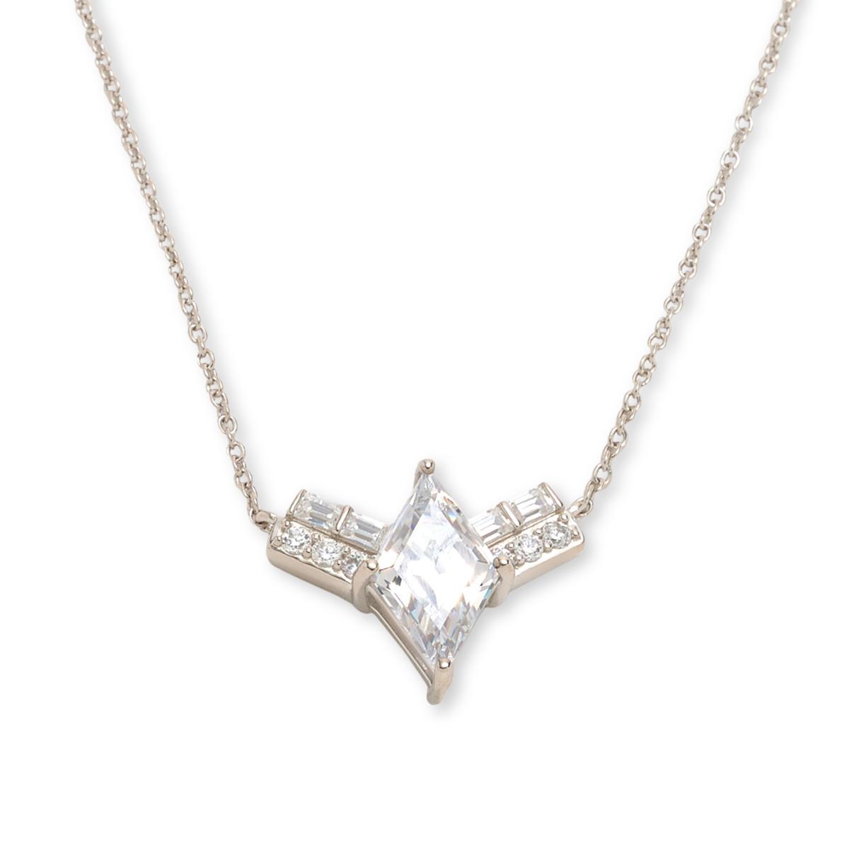 A stone-intensive stunner, this mixed-shape necklace features a variety of stone cuts that form an angular chevron drop. The look? Dynamic, adventurous. Perfect for showing off your statement-making sense of classic style.