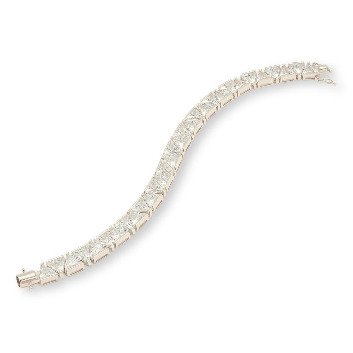 - Single row of prong- and bar-set, triangular/trilliant-cut, clear Absolute simulated diamonds; linked line design; 8mm stones