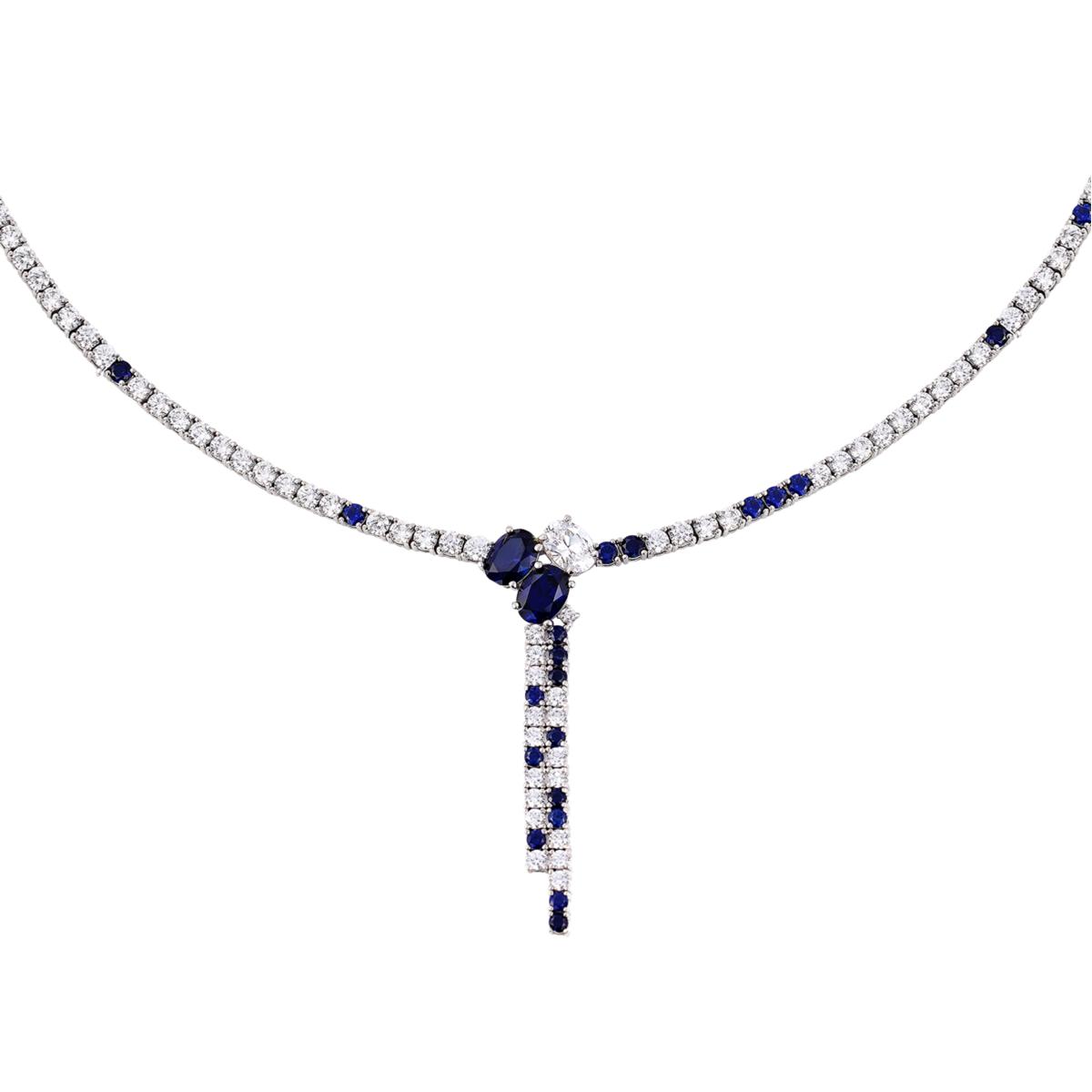 Clear and sapphire-color stones adorn this modern, double-dangle line necklace. It's a versatile eye-catcher that's perfect for any occasion.