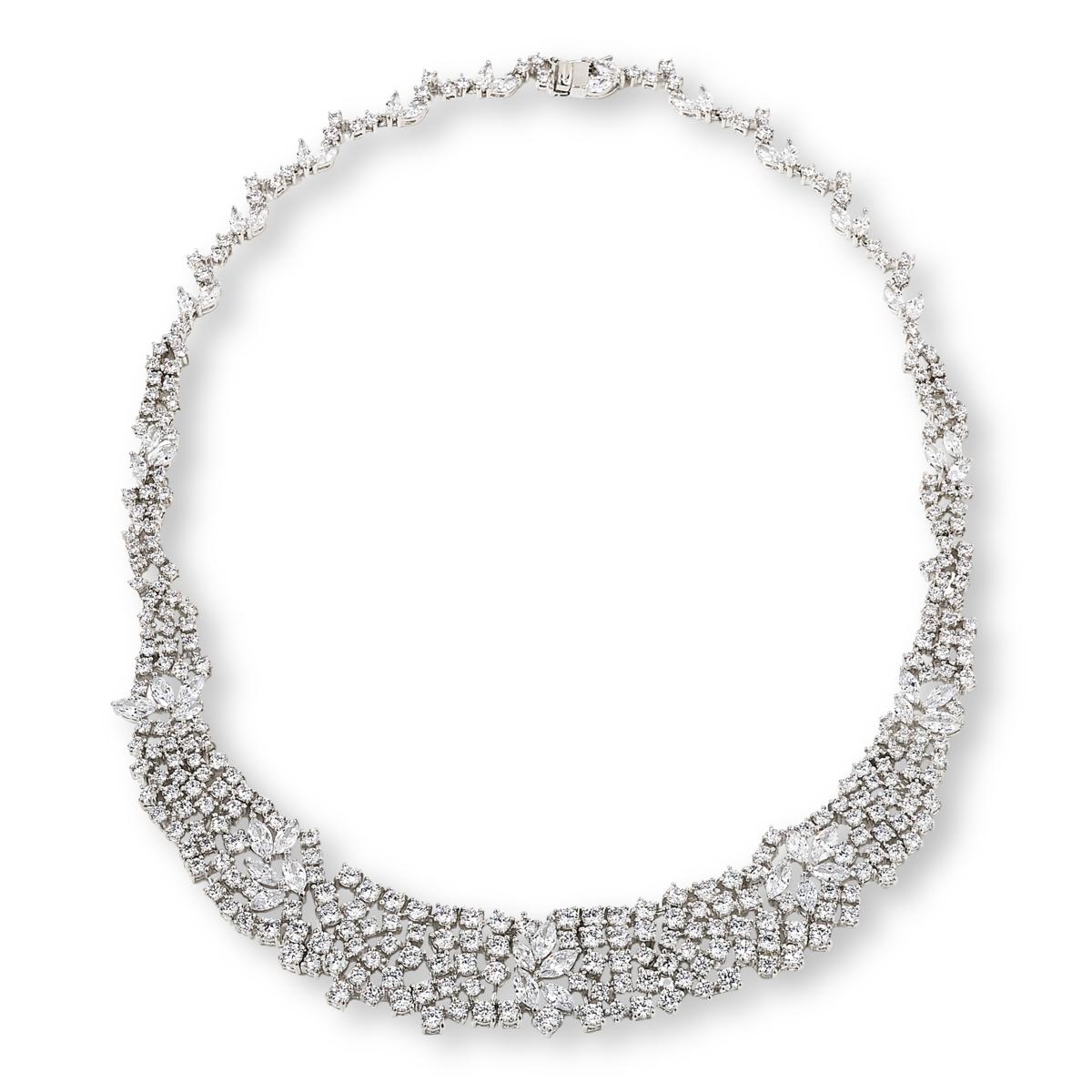 Bright simulated diamonds cluster over the length of this necklace, an elegantly tapered bib design with an adventurous feeling that's so modern. Perfect for wearing as a statement style.
