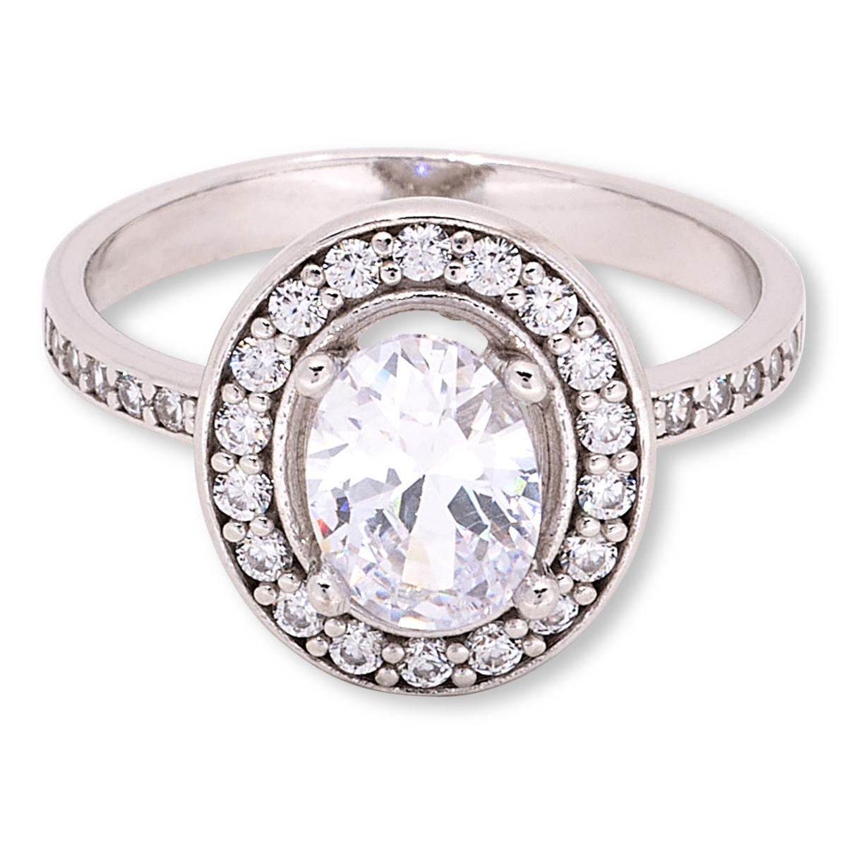 Showcasing a bold, oval simulated diamond in a frame that's ablaze with pavé rounds, this halo ring from Katharine McPhee serves up classic style that's big on sparkle.
