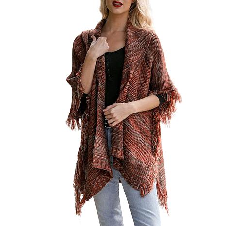 This knit Ruana features armholes and frayed details that makes it easy and versatile to wear.