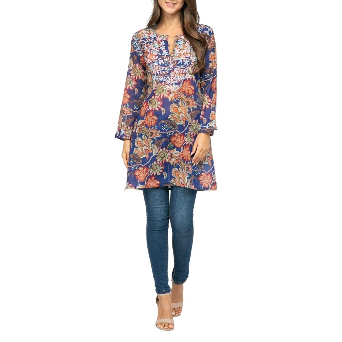 Wildflower Tunic is adorned in bold contrast stitch embroidery. Made with sheer light weight cotton. Effortless casual elegance to wear with denims, shorts, leggings and bikinis.
