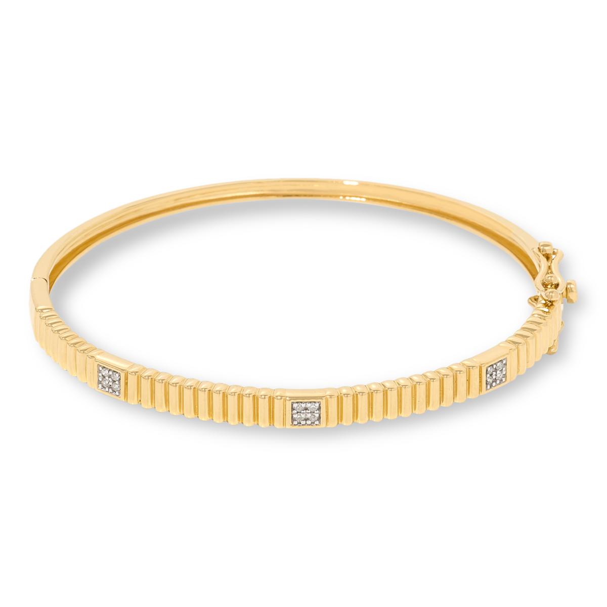 An on-trend design, etched texture and clusters of sparkling diamonds give this gold-plated bangle-style bracelet a luxe, custom look that's sure to set you apart from the crowd! Choose White, Champagne- or Blue-colored diamonds.