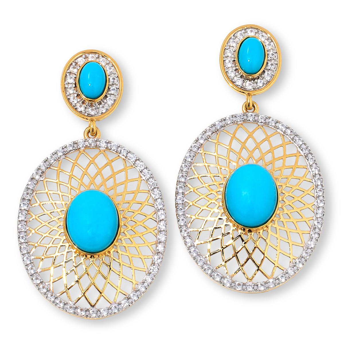 - Oval drops feature an oval gemstone cabochon at center surrounded by gold-plated filigree and a halo of white zircons