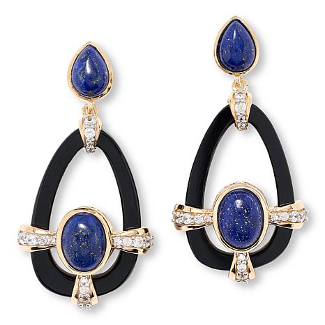 - Pear-shaped drop earrings with blue lapis, black onyx, and white zircon stone