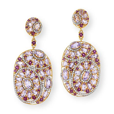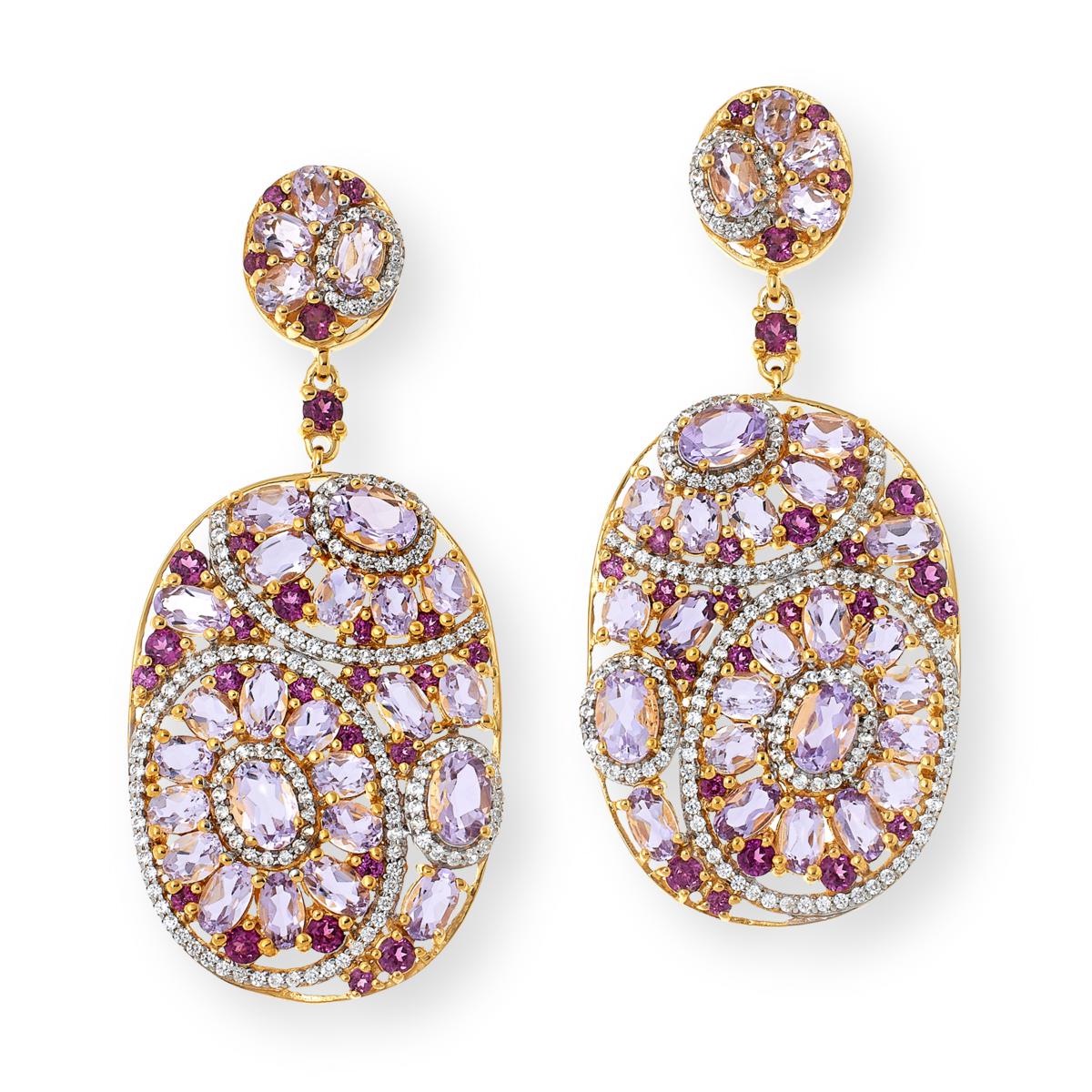 A bevy of beautiful gemstones arranged in a floral-inspired pattern, give these gold-plated earrings a luxe, extravagant feel. With more than 15-carats of pretty pink amethyst, purple rhodolite and diamond-like white zircons, these decadent drops are show-stopping conversation pieces for sure!