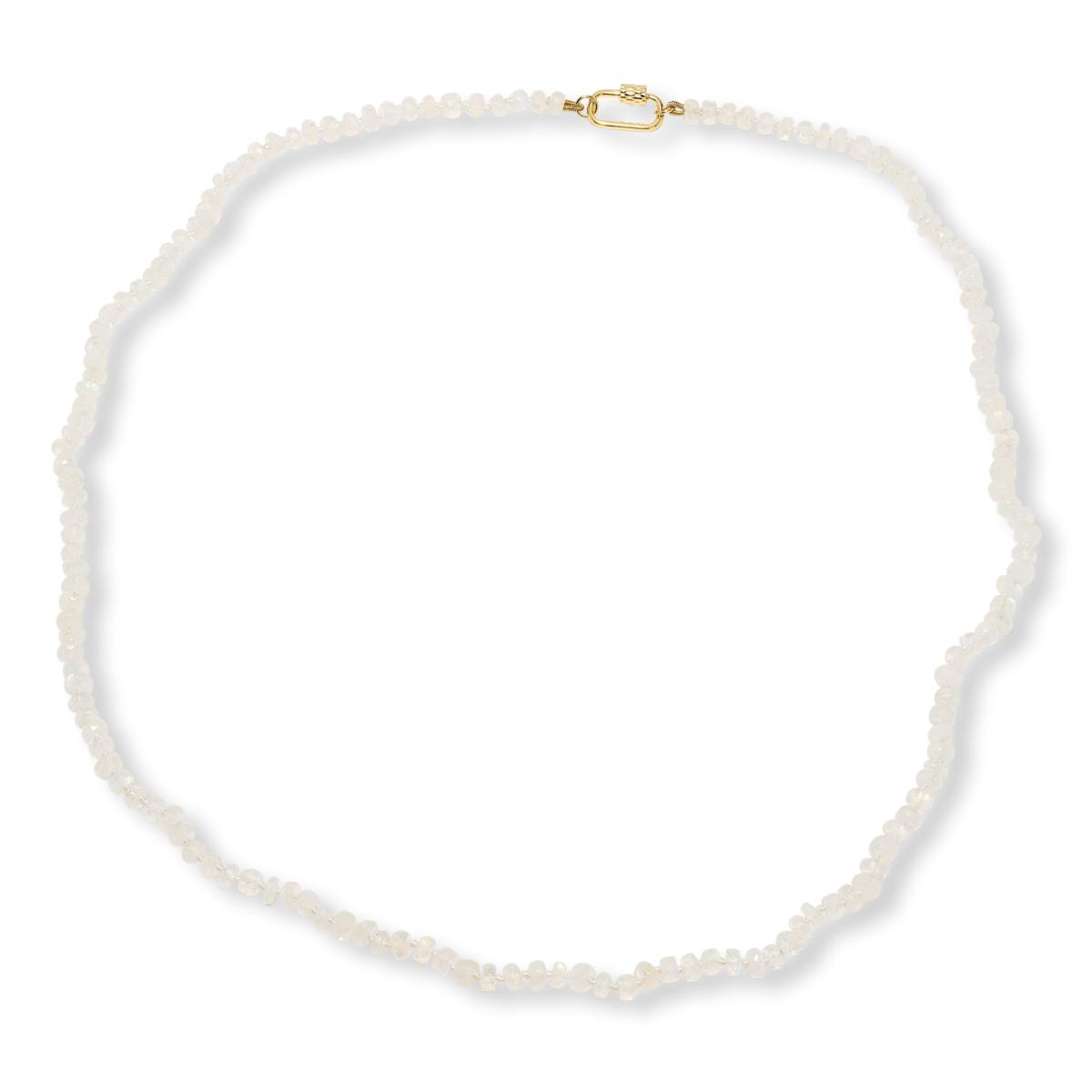 The mystery behind rainbow moonstone makes this carved rondel necklace truly captivating. Featuring a fabulous carabiner clasp, it’s perfect for hanging your favorite charms and creating a personalized look. This versatile piece adds a touch of magic to any outfit, day or night.