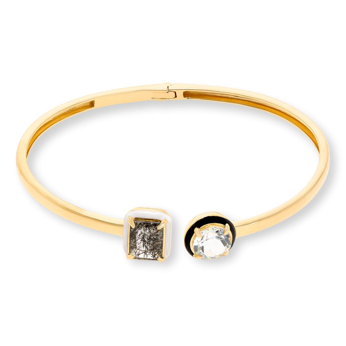 Embrace a touch of luxury with this slender bracelet from Rarities. Perfect for adding a sophisticated sparkle to any outfit, the cuff features a striking white topaz on one end and an elegant rutilated quartz on the other end. Warm yellow gold finish and glossy black enamel detail add an extra hint of style, while a lightweight design ensures comfort for daily wear.