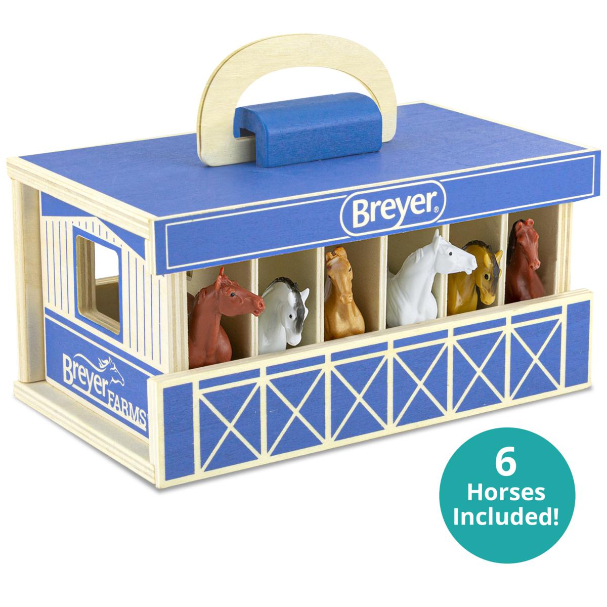 This high-quality wood stable comes complete with 6 stablemates horses. Designed to be easy for small hands to carry, the wooden stable playset with carry handle makes the perfect take-along toy. Breyer Farms is a collection honoring the timeless charm of keepsake toys, complete with the unparalleled detail you expect from Breyer. Each carefully crafted piece celebrates the down-to-earth beauty of horses and farm life and gives ample room for a child’s creativity and imagination to shine. Whether a traditional best-seller or brand-new product, every Breyer horse is created by hand, under the watchful eye of the world's leading equine experts. Our commitment to high quality material and hand crafting mean that just like in nature, no two Breyer models are exactly alike. Because nothing is as magical as having a horse of your very own. Quite simply, we want to help everyone discover how inspiring horses can be. Bring home a Breyer model, and let your imagination run free.