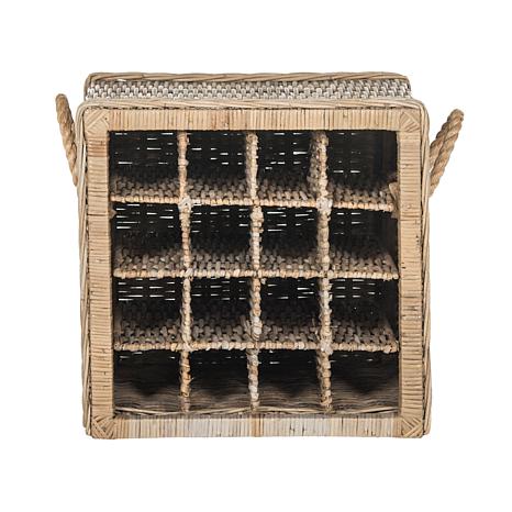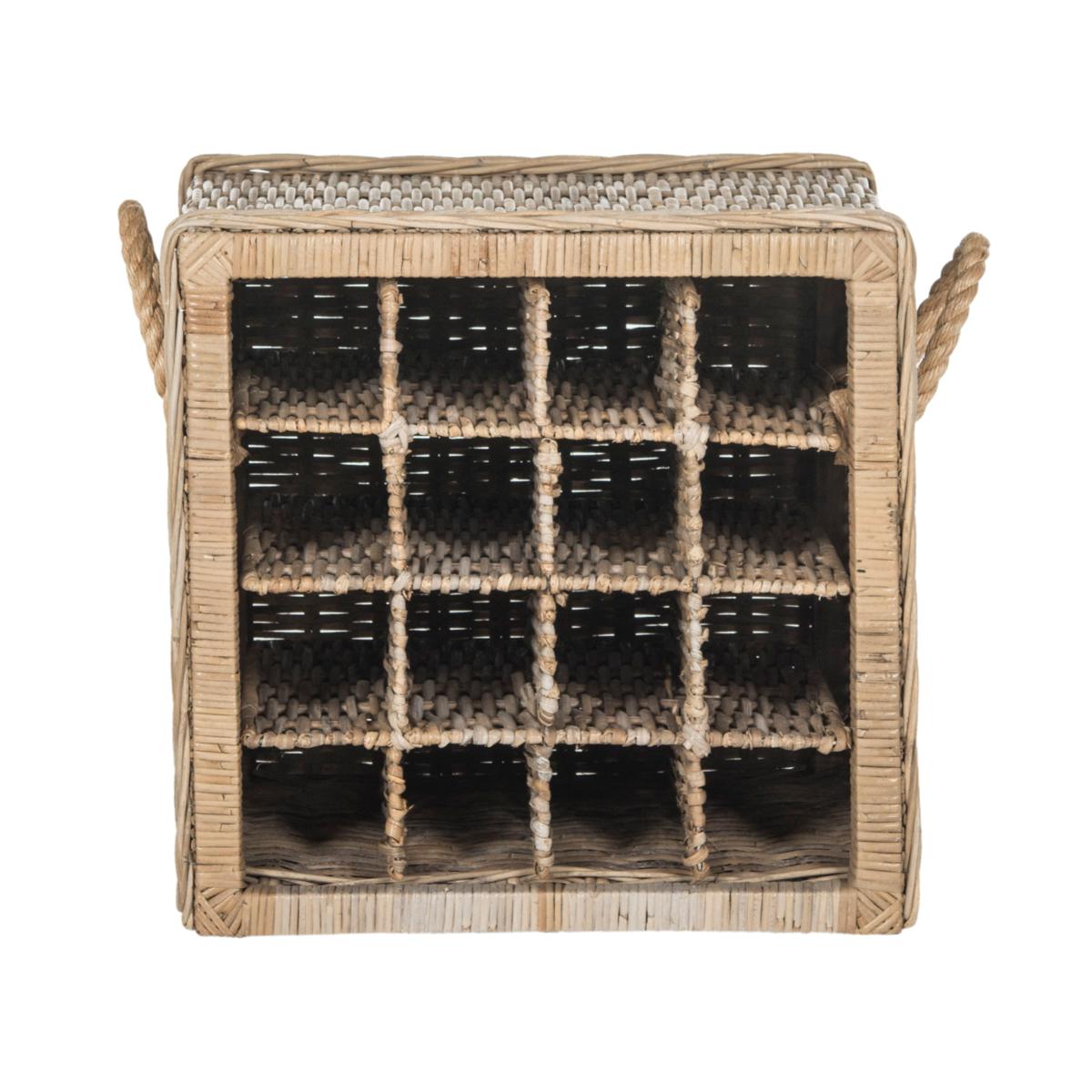 A toast to casual style, this charming rattan wine rack holds 16 of your finest bottles in an artfully crafted frame. With handles and the word Vin stamped on its sides for French flavor, it features a combination of kubu rattan and mahogany.
