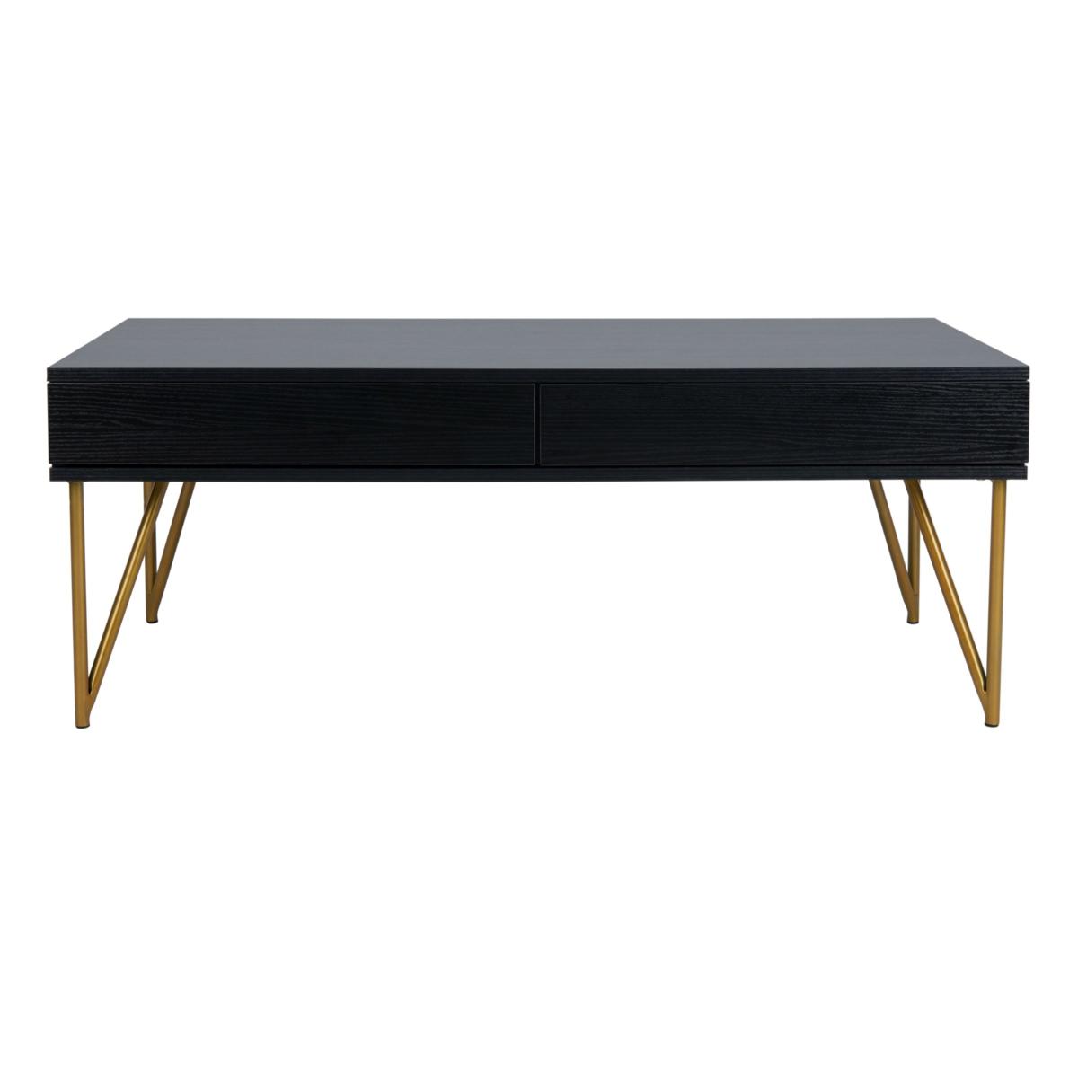 Refresh and renew your living room with the retro style of this pine two-drawer coffee table. Warm and inviting, its wood craftsmanship highlights the clean lines of its generous storage space, while the illustrious gold finish on its legs offers a modern, eye-catching touch.