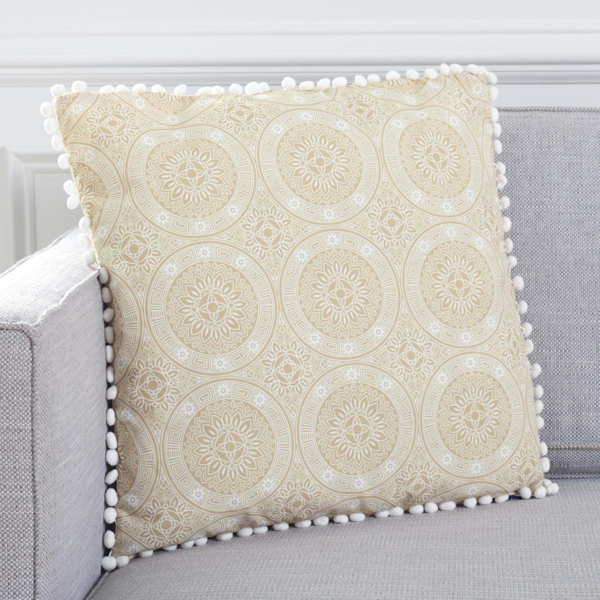 Embrace the charm of floral elegance with this contemporary pillow featuring deluxe modern floral medallion patterns in soothing taupe and beige. Perfect for adding a touch of sophistication to any chair or sofa, it also delights with chic pom pom tassels that bring fun style to your space.