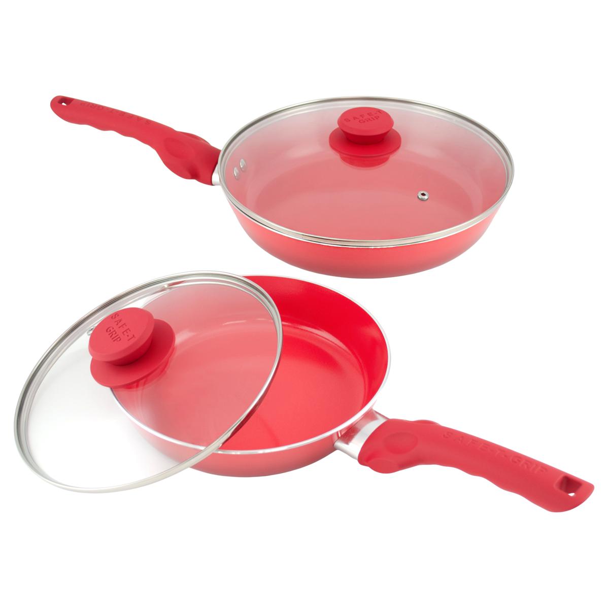 Make it easier on yourself in the kitchen with this set of two Safe-T-Grip Ceramic Nonstick Frypans. Designed for stability and balance, they're made to grip easily with either hand as you move around your kitchen. Perfect for cooks seeking stability! The set includes an 8" and a 10" skillet, each with "cook & look" lids, so you can keep an eye on your recipe without having to lose heat by opening the lid. And they allow for controlled moisture release, preventing steam buildup and potential boiling over. Suitable for all cooktops but induction. Dishwasher safe.