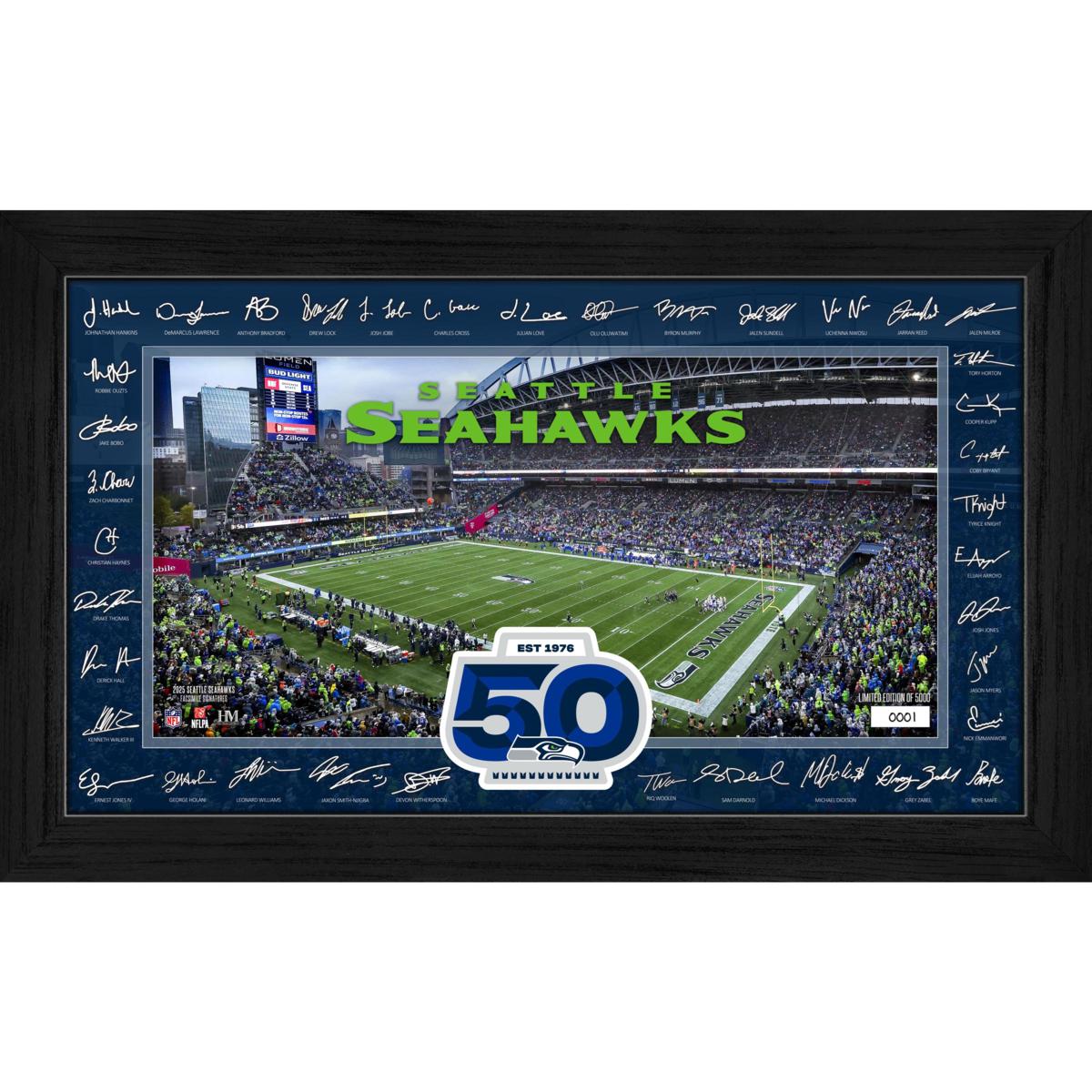Display your fandom in style with this 12" x 20" Signature Gridiron frame, showcasing an individually hand-numbered print of the Seattle Seahawks home field and surrounded by the facsimile (replica) signatures of most of the 2025 team roster. Elegantly presented under acrylic glass, this officially licensed collectible is a limited edition of 5,000 (and accompanied by a certificate of authenticity).