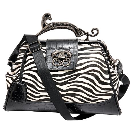 Step out in style with this beautiful patterned haircalf satchel featuring a sculptural, cougar-shaped metal handle that’s sure to turn heads. Add the adjustable guitar strap to easily switch to a hands-free crossbody in seconds. With multiple pockets and a secure turn lock, it’s designed to keep you organized and effortlessly fashionable wherever you go!