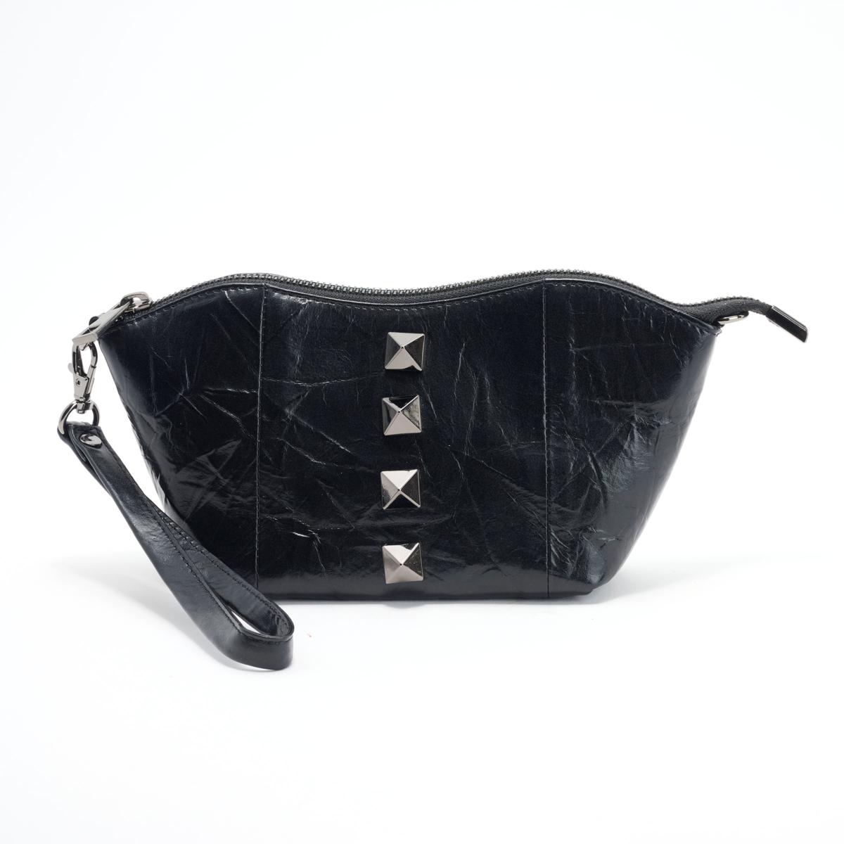 At the intersection of feminine and edgy, you'll find this leather sweetheart studded wristlet from Sharif Legacy. Soft, supple leather punctuated by pyramid studs and finished with a chic sweetheart shape cool-girl silhouette, it's perfect to throw in your bigger bag filled with cosmetics, toiletries, or take it out all by itself with just-the-essentials.