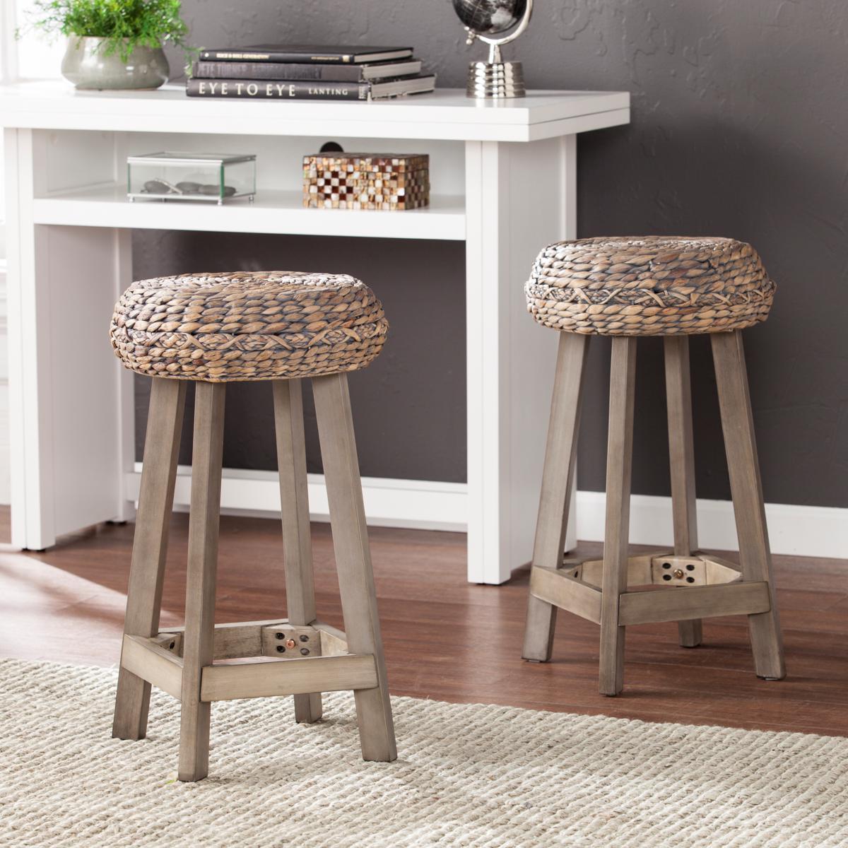Soft coastal style comes to breakfast with this pair of hyacinth counter stools. Gray-washed natural fibers weave a mesmerizing pattern into the round seat, mingling with the weathered gray base for an eclectic, monochromatic look. Round out spare seating with these backless counter stools in an eat-in kitchen, dressing area, or home office. Weathered, gray-washed finish, and natural hyacinth will vary adding unique style.