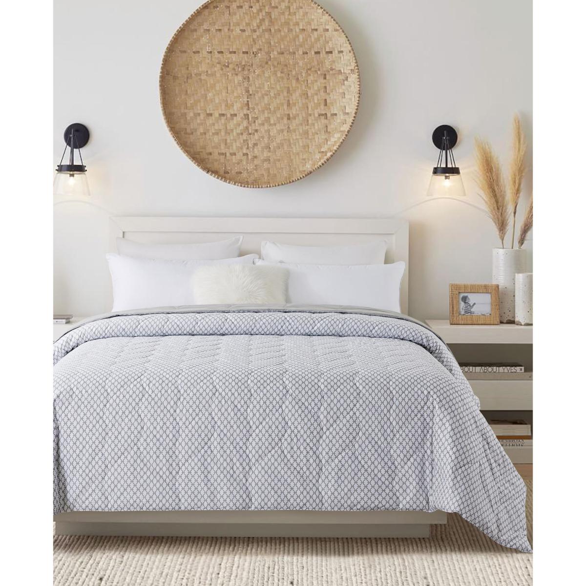 The versatile Waverly Antimicrobial Cotton Reversible Down Alternative Blanket is designed to combine fashion and comfort. A signature Waverly stitching pattern throughout adds a unique style to any room. Constructed with a subtle printed design on the face, with a coordinating solid gray reverse. A 100% cotton fabric and 100% hypoallergenic polyester fill will provide you with year-round warmth and comfort.